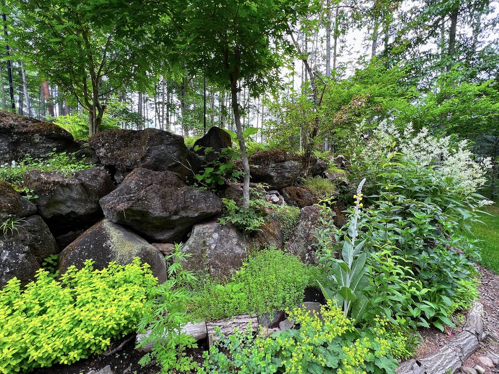岩の隙間に植えていた芝桜はすごくモリモリに育っています。